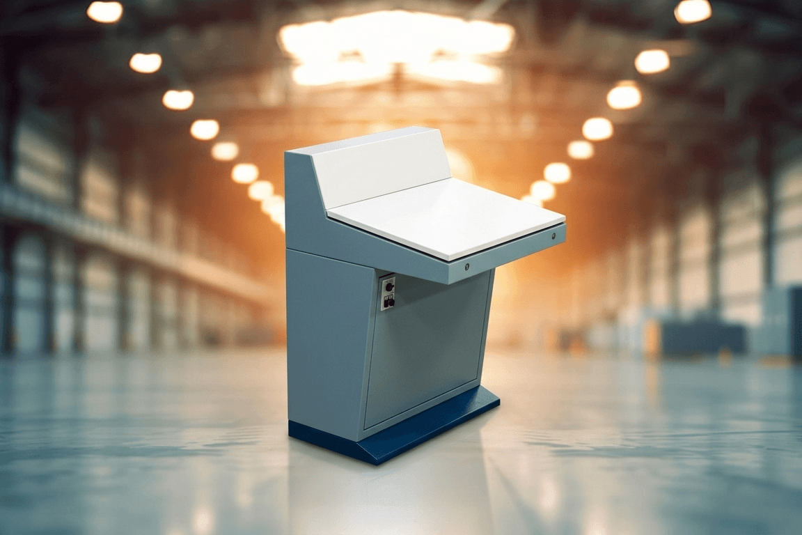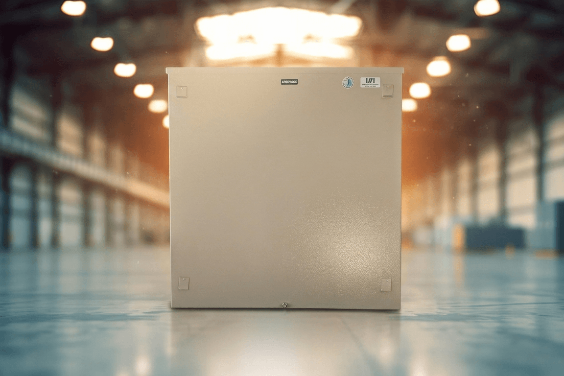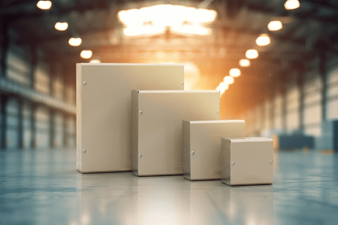 • As caixas são produzidas em chapa galvanizada, dobradas e soldadas, dependendo do seu tamanho e formato. Pintura eletrostática Bege