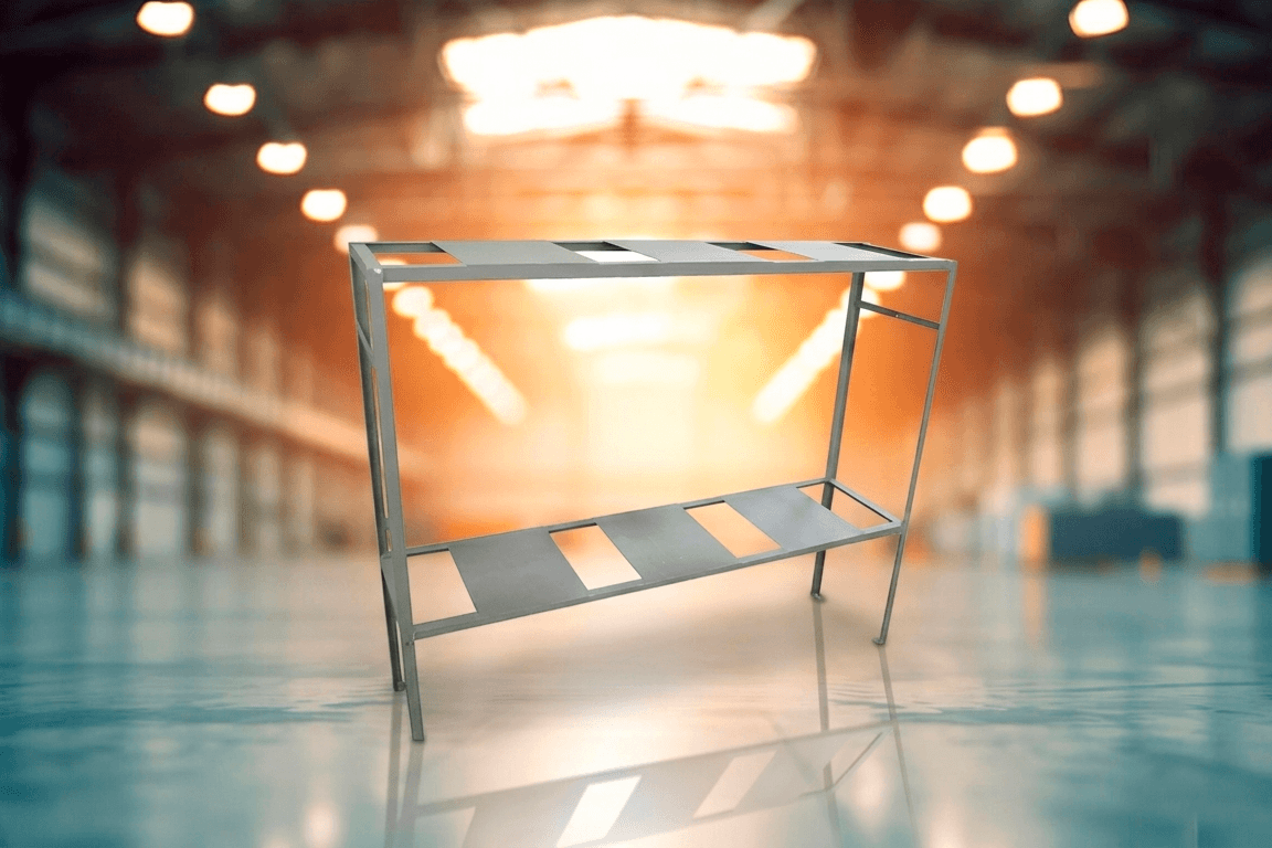• Estrutura desmontável, em chapa galvanizada, com colunas perfuradas, com pintura eletrostática na cor Bege;